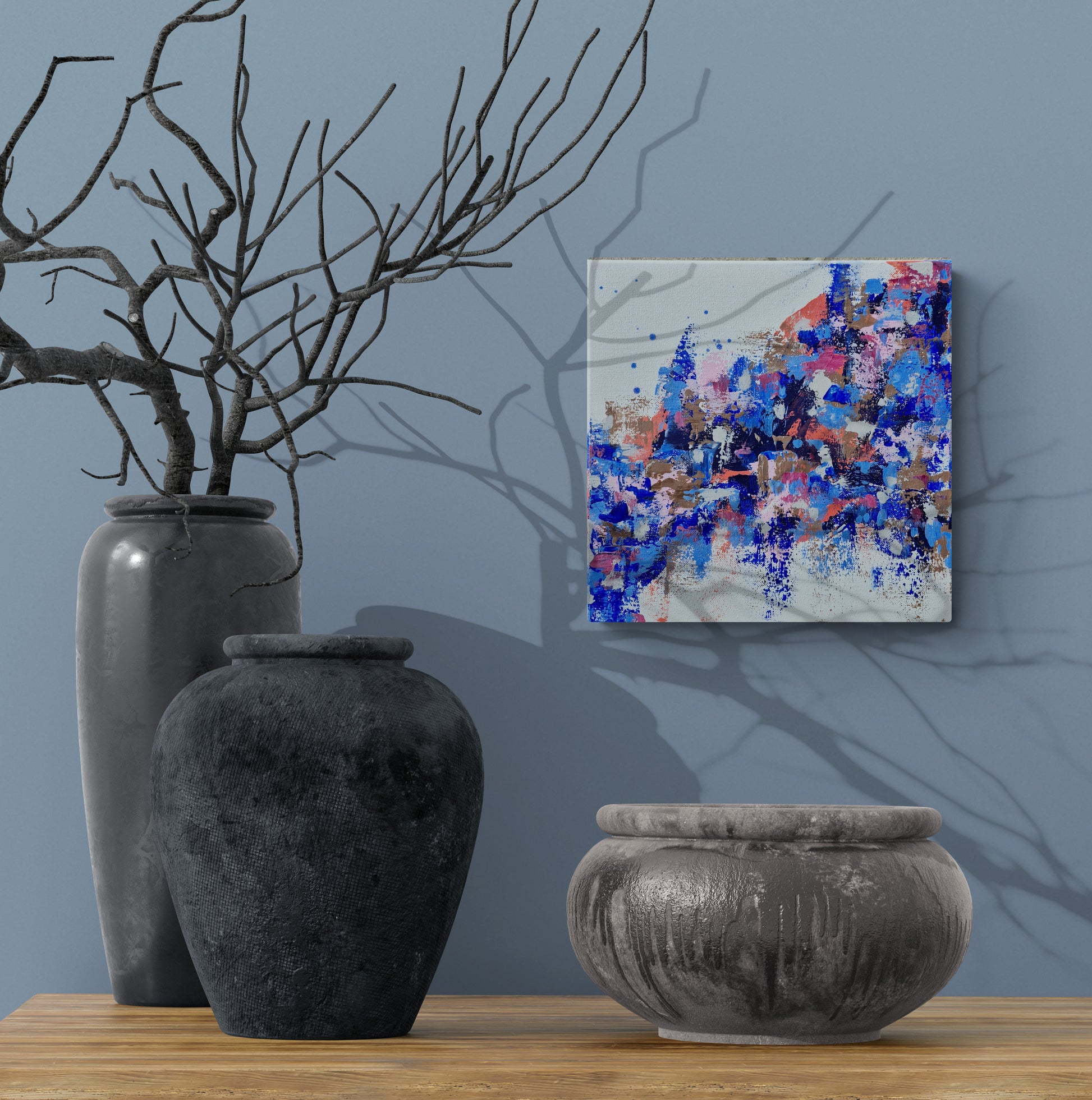 Abstrakt maleri malet med akryl på lærred. Maleriet er sprayet med et tyndt lag mat lak, for at beskytte mod sollys og støv. Maleriet sælges uden ramme. Maleriet er signeret med mit navn og årstal, på bagsiden.
